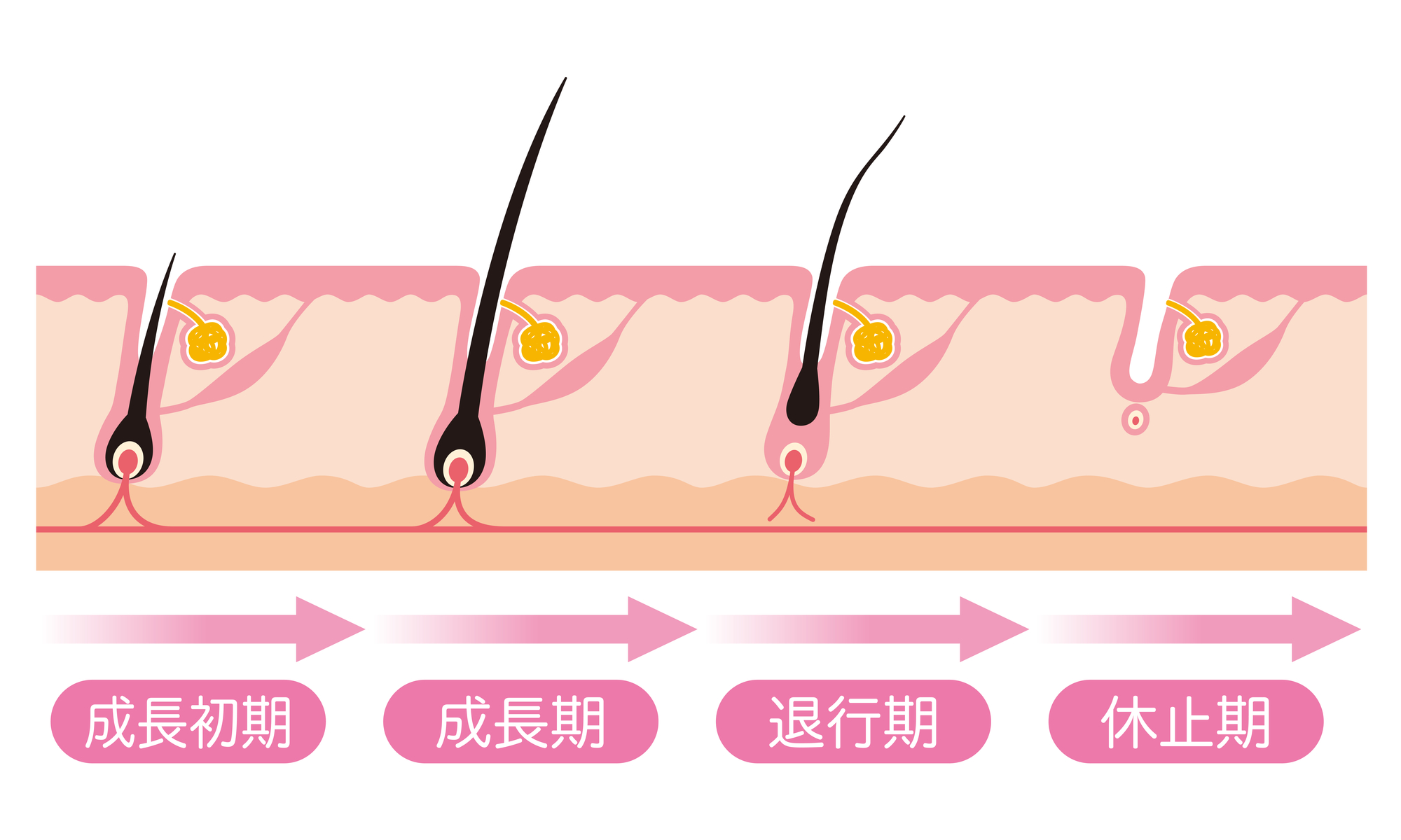 また、髪はヘアサイクルによって①成長期⇒②退行期⇒③休止期を繰り返しています。